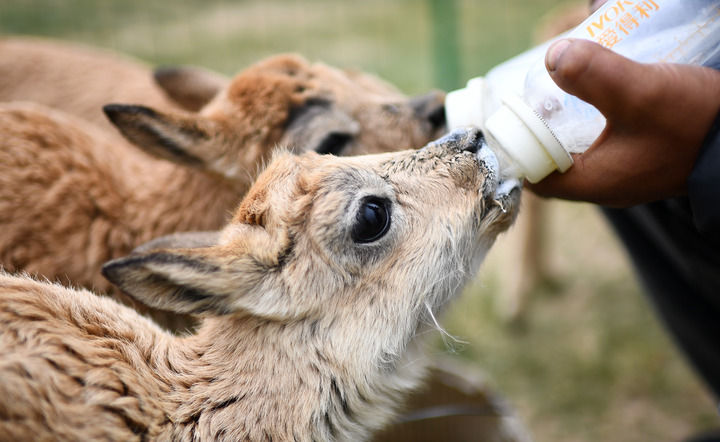 在索南達(dá)杰保護站,可可西里巡山隊隊員在給被救助的藏羚羊幼仔喂奶(2023年7月28日攝)。新華社記者 張宏祥 攝