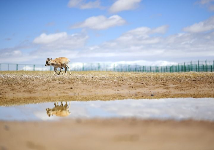 藏羚羊在可可西里國家級自然保護區(qū)索南達(dá)杰保護站野生動物救助中心活動(2023年5月30日攝)。新華社記者 薛玉斌 攝