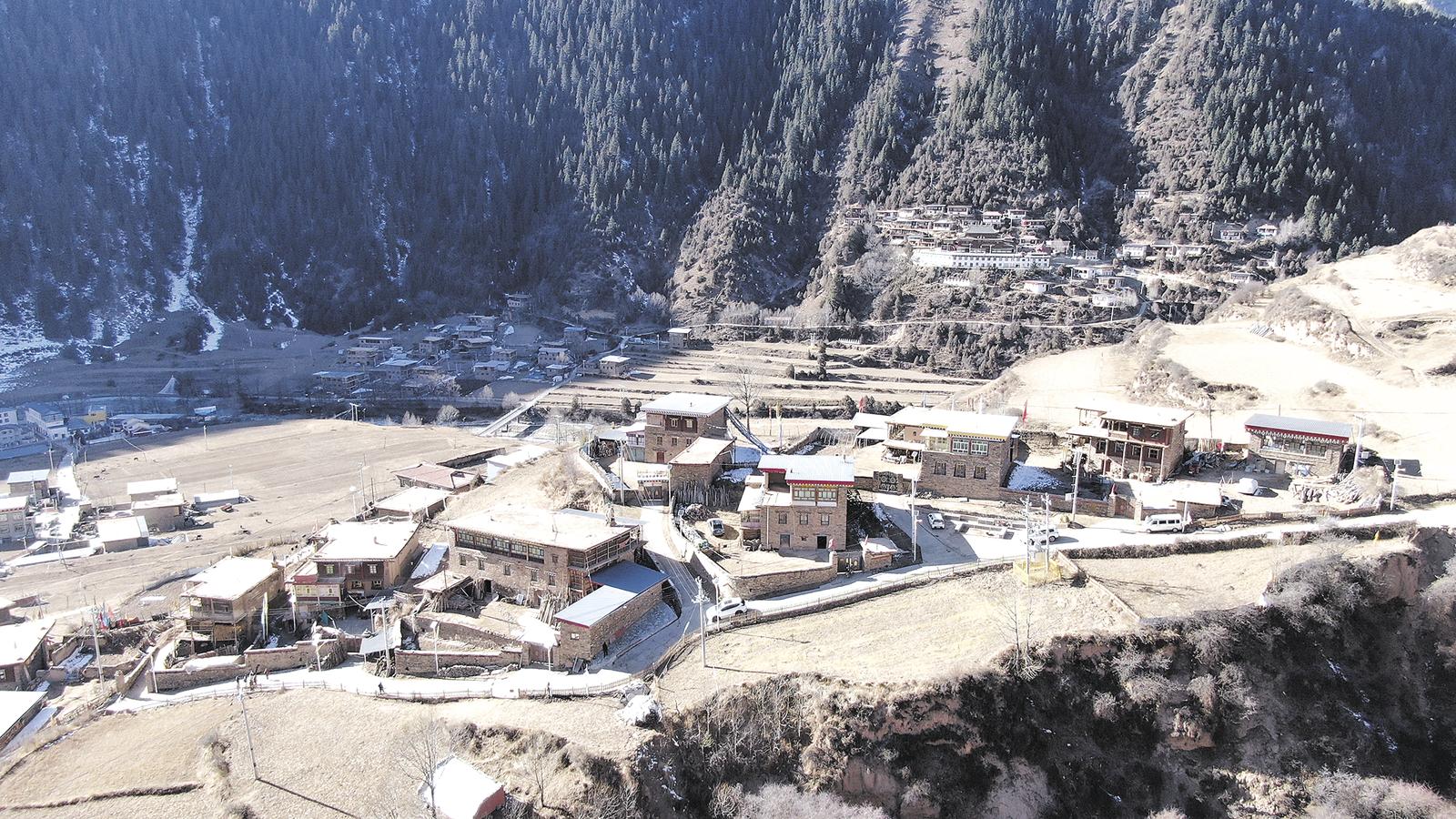 1月13日,記者從班瑪縣出發(fā),沿著蜿蜒的瑪珂河一路南下,來到了“中國保存最完好的藏式碉樓群落之一”的班瑪縣燈塔鄉(xiāng)班前村。走進(jìn)班前村,只見四面群山環(huán)繞,不遠(yuǎn)處,結(jié)著冰的瑪珂河像一條白絲帶,在陽光的照耀下格外耀眼。依山傍水的班前村地勢起伏較大,行走其間多半為上坡路,不一會兒,記者來到一處相對平坦的房屋前,上面掛著的匾額上赫然寫著“中國傳統(tǒng)村落——班前村”。