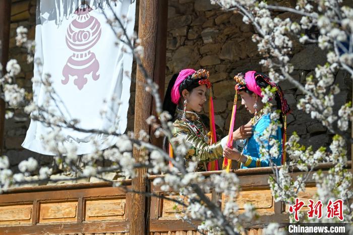3月25日,四川丹巴,藏房梨花樹(shù)下的丹巴女孩。中新社記者 劉忠俊 攝