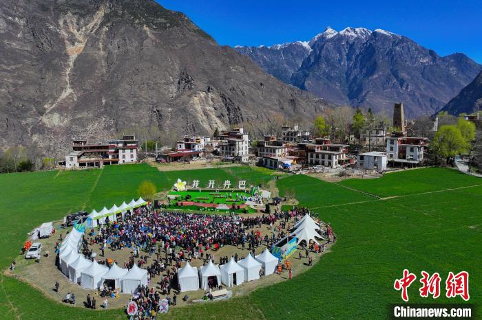 3月25日,四川丹巴,中路藏寨海子坪田野上的音樂(lè)會(huì)吸引了不少村民或游客。(無(wú)人機(jī)照片)中新社記者 劉忠俊 攝