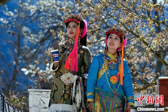3月25日,四川丹巴,身著漂亮民族服飾的丹巴女孩們?cè)诶婊?shù)下合影拍照。中新社記者 劉忠俊 攝