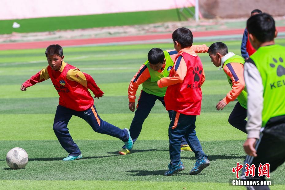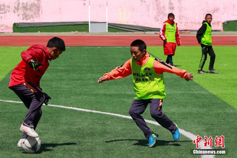 4月13日,青海省玉樹(shù)藏族自治州曲麻萊縣青少年足球訓(xùn)練基地內(nèi),球員進(jìn)行對(duì)抗賽。曲麻萊縣地處黃河源頭,平均海拔超過(guò)4500米。近年來(lái),該縣以足球青訓(xùn)為抓手,打造青藏高原青少年足球發(fā)展典范。中新社記者 薛蒂 攝