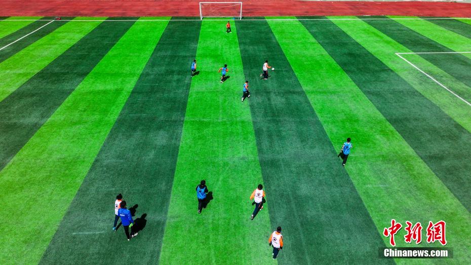 4月13日,青海省玉樹(shù)藏族自治州曲麻萊縣青少年足球訓(xùn)練基地內(nèi),球員分隊(duì)比賽。曲麻萊縣地處黃河源頭,平均海拔超過(guò)4500米。近年來(lái),該縣以足球青訓(xùn)為抓手,打造青藏高原青少年足球發(fā)展典范。(無(wú)人機(jī)照片)中新社記者 薛蒂 攝