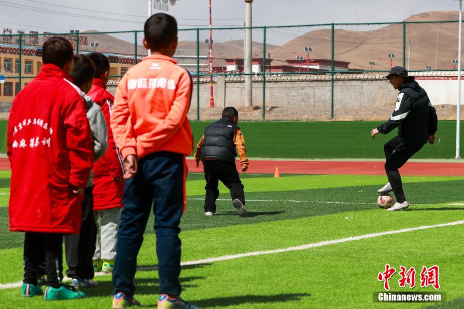 4月13日,青海省玉樹(shù)藏族自治州曲麻萊縣青少年足球訓(xùn)練基地內(nèi),教練(右一)進(jìn)行技術(shù)指導(dǎo)。曲麻萊縣地處黃河源頭,平均海拔超過(guò)4500米。近年來(lái),該縣以足球青訓(xùn)為抓手,打造青藏高原青少年足球發(fā)展典范。中新社記者 薛蒂 攝