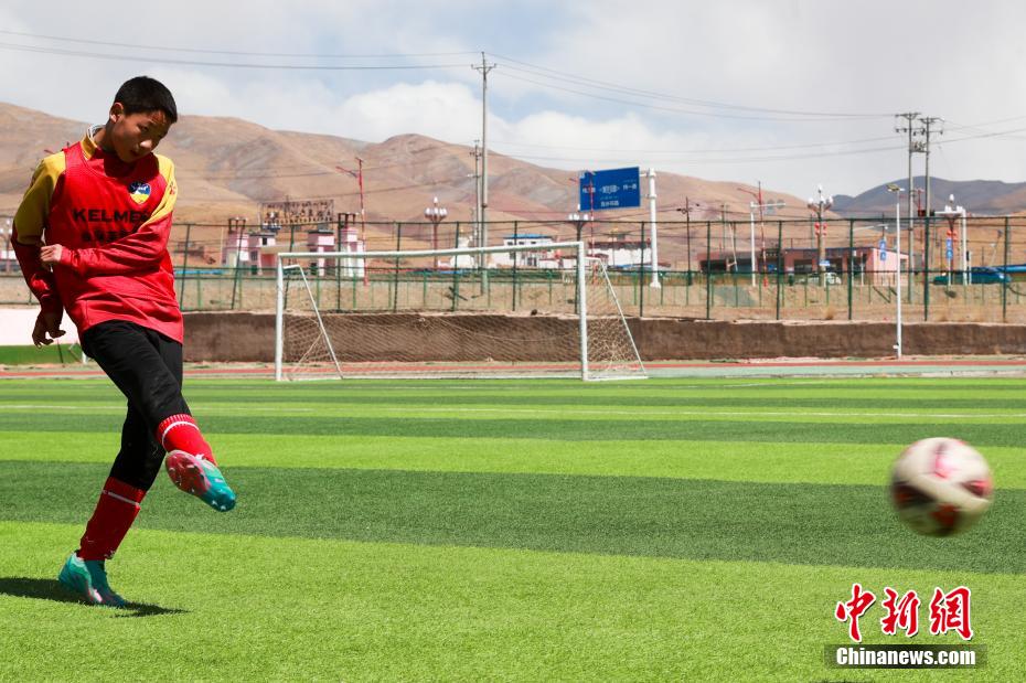 4月13日,青海省玉樹(shù)藏族自治州曲麻萊縣青少年足球訓(xùn)練基地內(nèi),球員在訓(xùn)練中。曲麻萊縣地處黃河源頭,平均海拔超過(guò)4500米。近年來(lái),該縣以足球青訓(xùn)為抓手,打造青藏高原青少年足球發(fā)展典范。中新社記者 薛蒂 攝