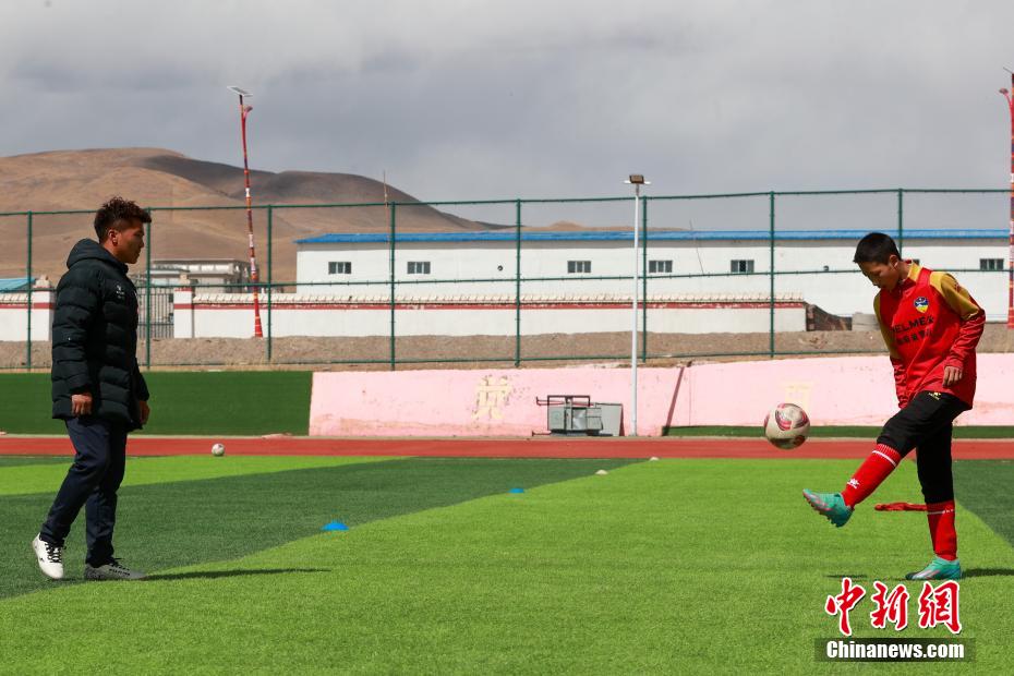 4月13日,青海省玉樹(shù)藏族自治州曲麻萊縣青少年足球訓(xùn)練基地內(nèi),教練(左)進(jìn)行技術(shù)指導(dǎo)。曲麻萊縣地處黃河源頭,平均海拔超過(guò)4500米。近年來(lái),該縣以足球青訓(xùn)為抓手,打造青藏高原青少年足球發(fā)展典范。中新社記者 薛蒂 攝