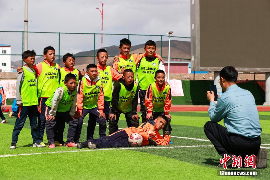4月13日,青海省玉樹(shù)藏族自治州曲麻萊縣青少年足球訓(xùn)練基地內(nèi),球員合影留念。曲麻萊縣地處黃河源頭,平均海拔超過(guò)4500米。近年來(lái),該縣以足球青訓(xùn)為抓手,打造青藏高原青少年足球發(fā)展典范。中新社記者 薛蒂 攝