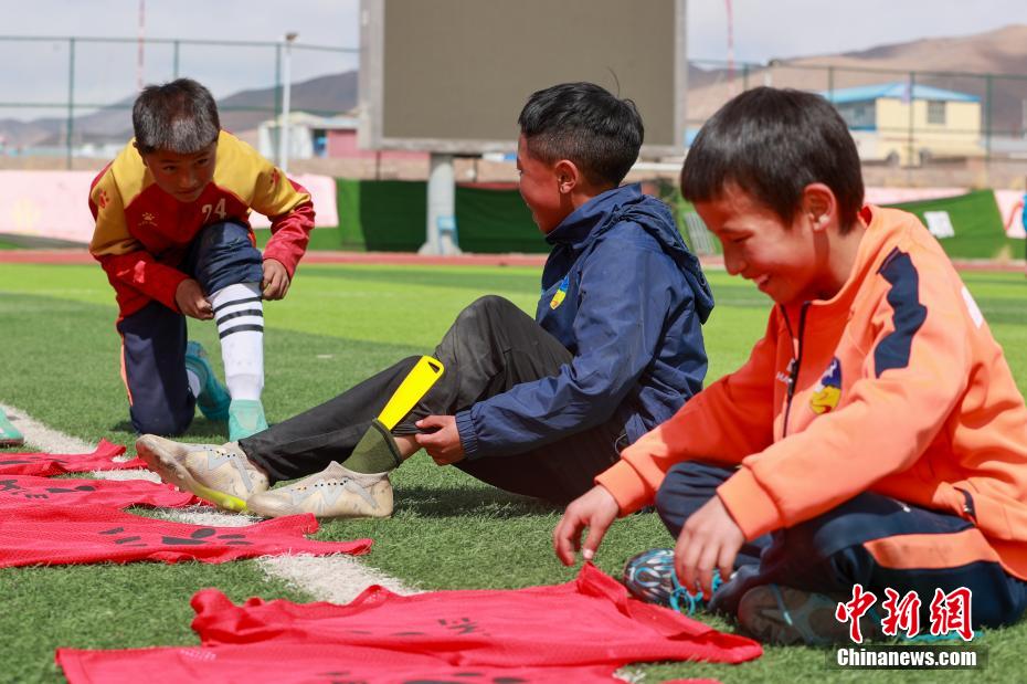 4月13日,青海省玉樹(shù)藏族自治州曲麻萊縣青少年足球訓(xùn)練基地內(nèi),球員賽前佩戴專(zhuān)業(yè)裝備。曲麻萊縣地處黃河源頭,平均海拔超過(guò)4500米。近年來(lái),該縣以足球青訓(xùn)為抓手,打造青藏高原青少年足球發(fā)展典范。中新社記者 薛蒂 攝