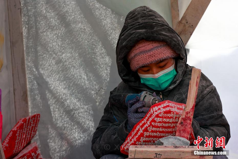 4月12日,在青海省玉樹藏族自治州玉樹市,匠人雕刻瑪尼石。據(jù)了解,玉樹嘉那瑪尼石的形成和發(fā)展已有300多年的歷史,嘉那瑪尼石經(jīng)城內(nèi)石刻數(shù)量多達(dá)25億塊,2002年被載入吉尼斯世界紀(jì)錄,成為世界最大的瑪尼堆。中新社記者 薛蒂 攝