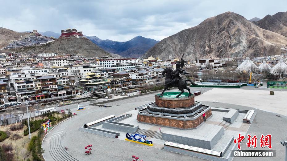 4月14日,航拍青海省玉樹藏族自治州玉樹市格薩爾王廣場。玉樹市地處三江之源,市區(qū)依山而建,扎曲河穿城而過,傳統(tǒng)藏式風(fēng)格建筑與現(xiàn)代化設(shè)施巧妙結(jié)合。(無人機(jī)照片)中新社記者 薛蒂 攝