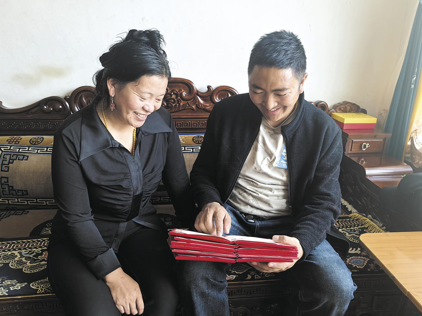 “不僅是這些,搬遷到日益格社區(qū),孩子上學(xué)的問題也隨之解決了?,F(xiàn)在,兩個(gè)小孩在離家不到一公里的玉樹市第五完全小學(xué)上學(xué),一個(gè)三年級(jí)一個(gè)五年級(jí),大女兒已經(jīng)在州中學(xué)讀初一,她們學(xué)習(xí)成績(jī)都不錯(cuò),孩子們從小就能在這么好的條件和環(huán)境里學(xué)習(xí)生活,是多么幸福的事啊。”說著,伊西南江指向客廳一側(cè)滿墻的獎(jiǎng)狀。