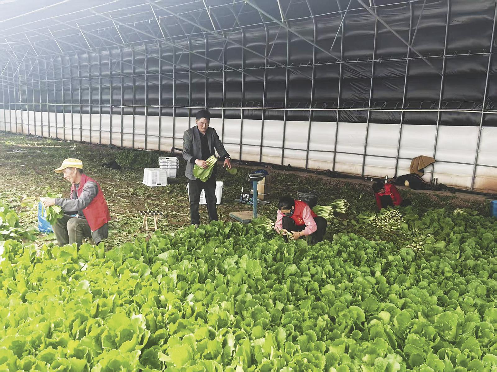 白虎升(左二)和員工在大棚里忙碌。受訪者供圖