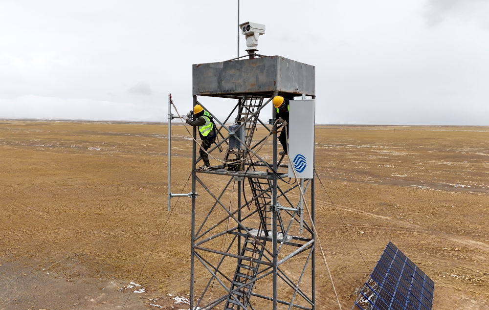 4月25日,中國移動通信集團青海有限公司工作人員在可可西里庫賽湖附近安裝5G基站設(shè)備。(受訪單位供圖)