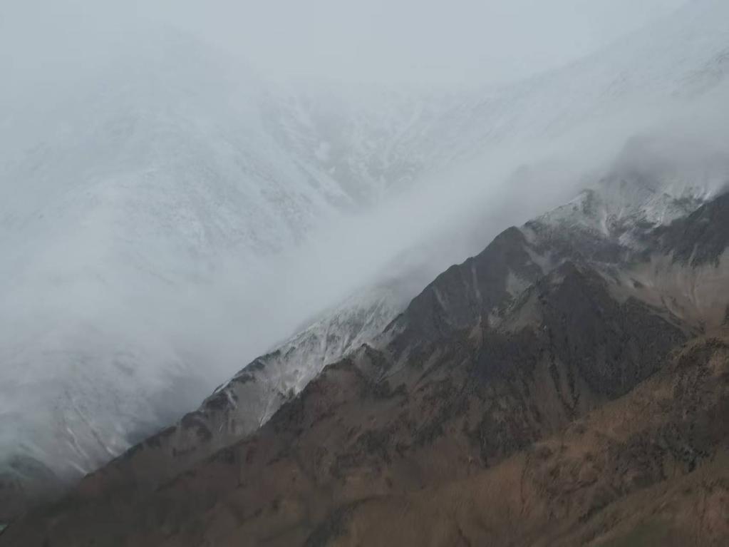 半個(gè)小時(shí)之后,風(fēng)勢在幾滴雨點(diǎn)的打擊下,漸漸緩和下來。當(dāng)沙幕隱去,露出被磨洗過的藍(lán)天時(shí),我們都長舒了一口氣。擋風(fēng)玻璃上的兩側(cè),裹了厚厚一層泥巴。遠(yuǎn)處的山峰頂上,白雪在太陽的余暉下,染成了金黃。