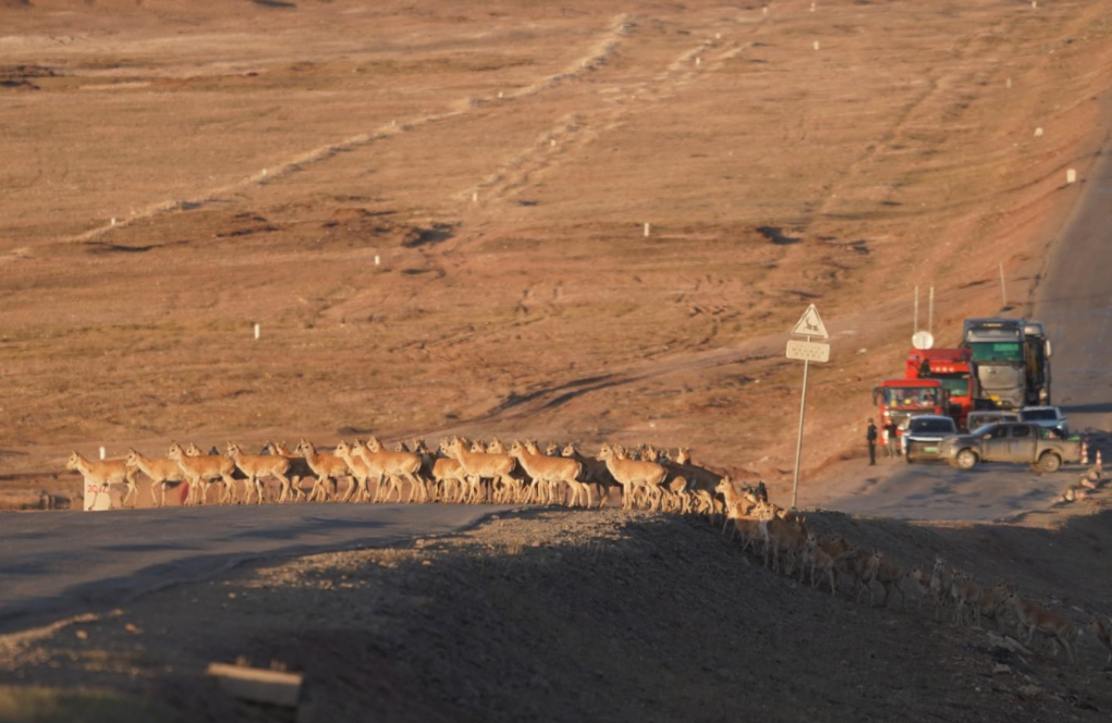 繁忙的公路突然“靜音”,遠(yuǎn)處車流、人群安靜等待,幾只藏羚羊緩慢踏上公路,頭羊反復(fù)“試探”確認(rèn)安全后,羊群再迅速穿過(guò)公路。