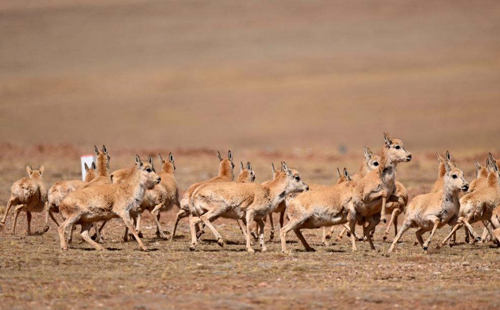 一群藏羚羊通過青藏公路后向卓乃湖行進(jìn)。新華社記者 張宏祥 攝