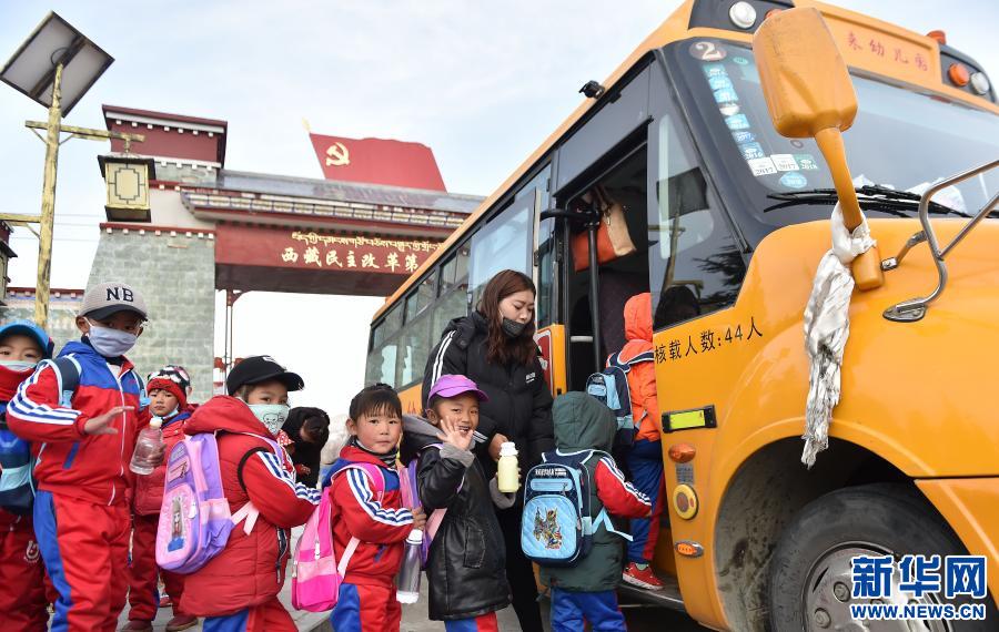 “西藏民主改革第一村”——西藏山南市乃東區(qū)昌珠鎮(zhèn)克松村的孩子們登上校車,出發(fā)去幼兒園(2018年3月27日攝)。新華社記者覺果 攝