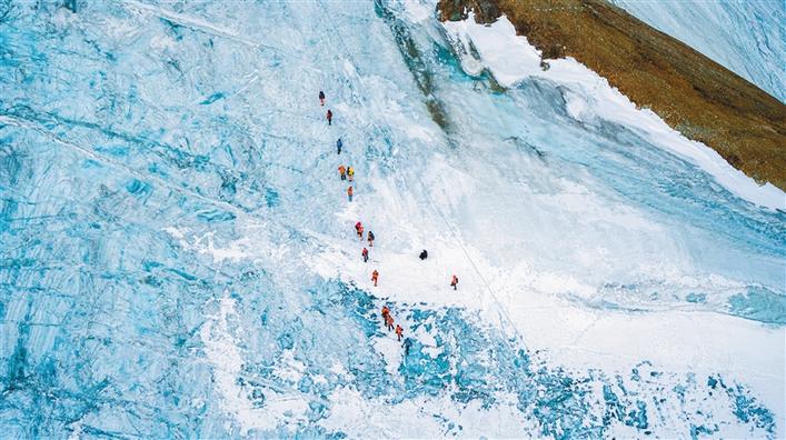 圖為當(dāng)雄縣格達鄉(xiāng)境內(nèi)的廓瓊崗日冰川公園內(nèi),游客與冰川近距離接觸,體驗攀登的樂趣。