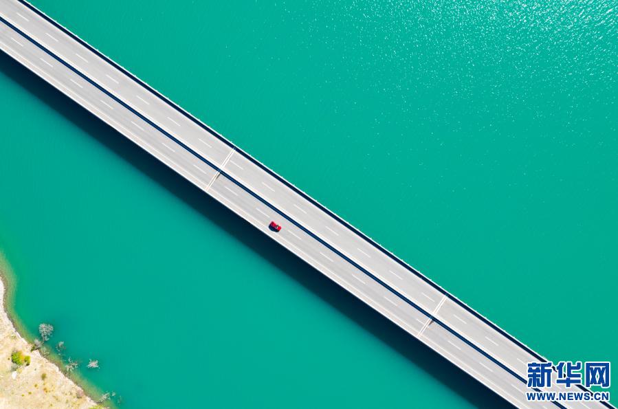 2019年10月28日,一輛汽車經(jīng)過林芝境內(nèi)的多布特大橋(無(wú)人機(jī)拍攝)。新華社記者 普布扎西 攝