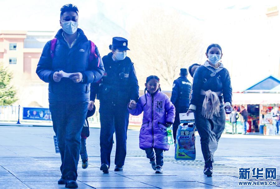 1月10日,“女子格桑花”警組民警在拉薩火車站帶領(lǐng)小旅客出站。新華社發(fā)(胡安鵬、黃飛攝影報(bào)道)