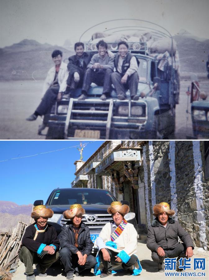 拼版照片:上圖:1994年,24歲的強(qiáng)巴(右二)和他的三個兄弟在西藏阿里地區(qū)跑運(yùn)輸時,在自己購買的“東風(fēng)”牌運(yùn)輸車前合影(強(qiáng)巴提供)。(新華社發(fā))