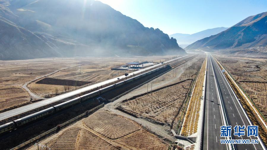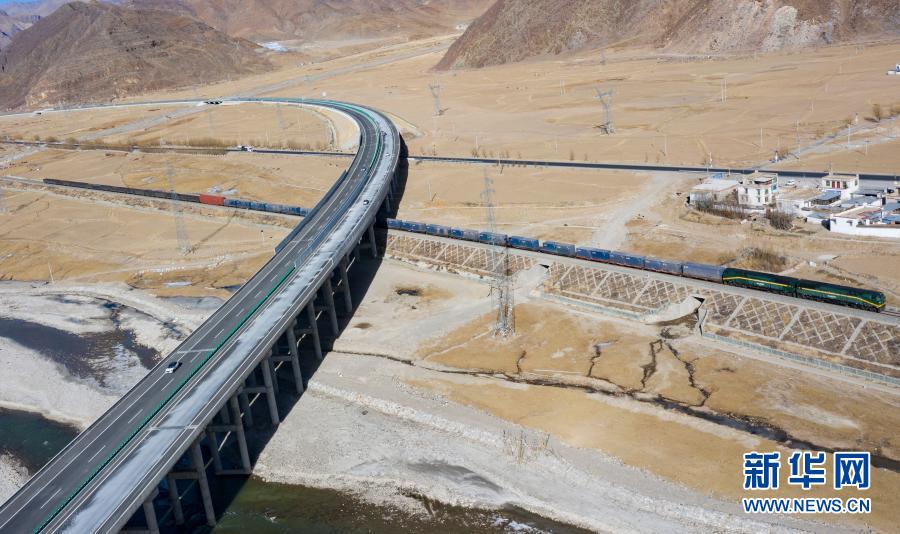 這是拉薩至那曲高等級公路和青藏鐵路沿線風光(1月28日攝,無人機照片)。新華社記者 普布扎西 攝