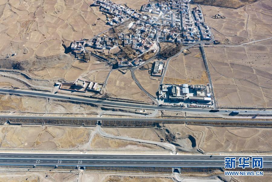 這是拉薩至那曲高等級公路(下)和青藏鐵路沿線村莊(1月28日攝,無人機照片)。新華社記者 孫非 攝