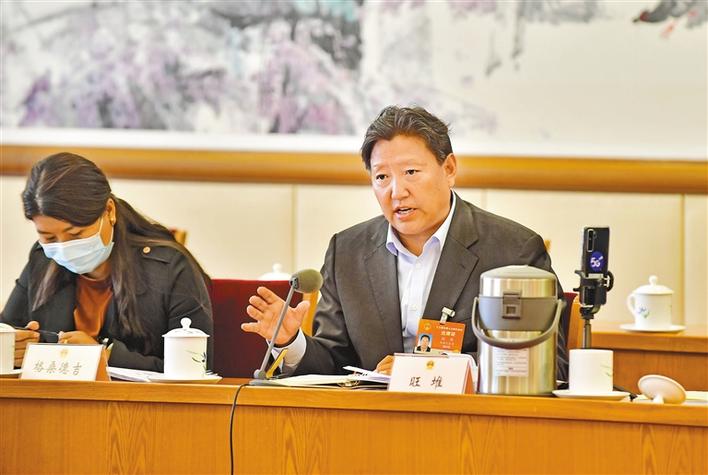 圖為全國人大代表旺堆在十三屆全國人大四次會議西藏代表團全體會議上發(fā)言。記者 旦增西旦 攝