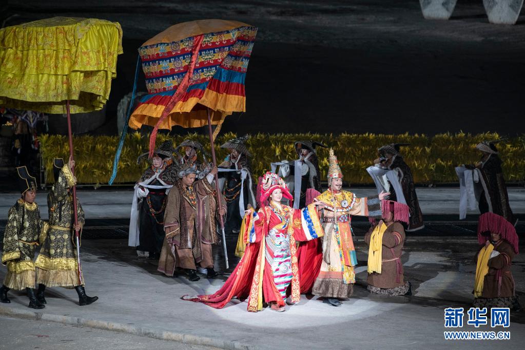 4月10日,演員在大型實景劇《文成公主》中演繹文成公主與松贊干布舉行婚禮的場景。新華社 孫瑞博 攝