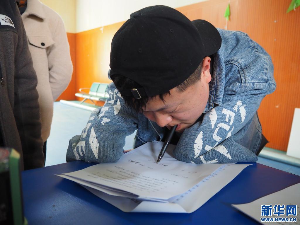 11日下午,位于西藏拉薩市的賽馬場正在舉行一場殘疾人創(chuàng)業(yè)滾動(dòng)資金發(fā)放儀式。岳曉天熟練地用嘴含著筆,在資金發(fā)放協(xié)議書上簽上了自己的名字,字跡美觀工整,絲毫看不出是用嘴含著筆寫的。