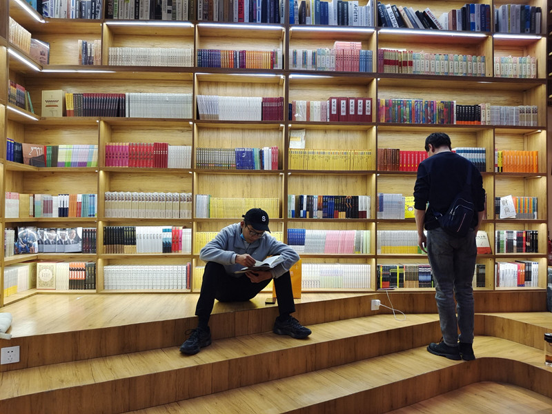 傍晚7點(diǎn),在萬達(dá)廣場(chǎng)的“央喜書吧”里,與朋友約好吃飯的市民拉姆趁著朋友還沒到,抽空選購著書籍;