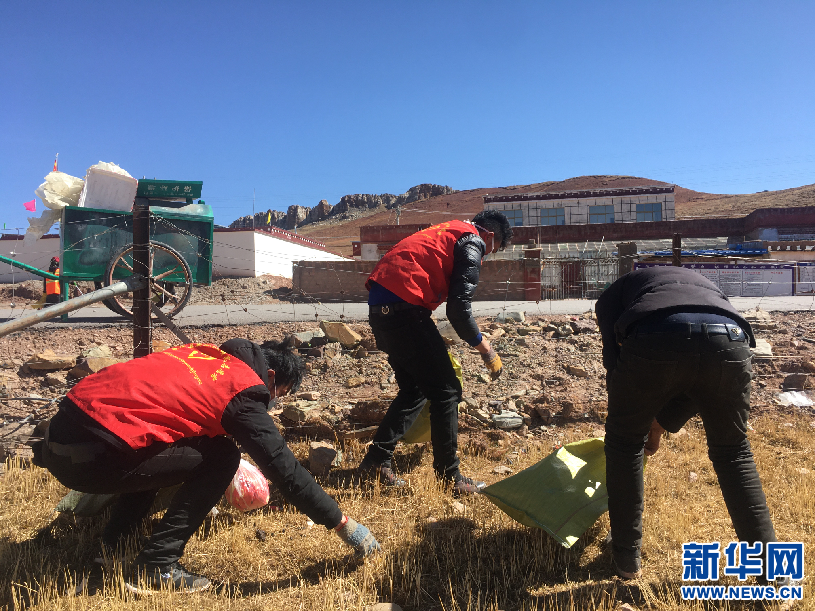 區(qū)黨校駐村工作隊(duì)組織在家牧民黨員在學(xué)校、廣場、村委會(huì)等場所集中清理生活垃圾和建筑垃圾(4月29日攝)。新華網(wǎng)發(fā) 王煦樟攝