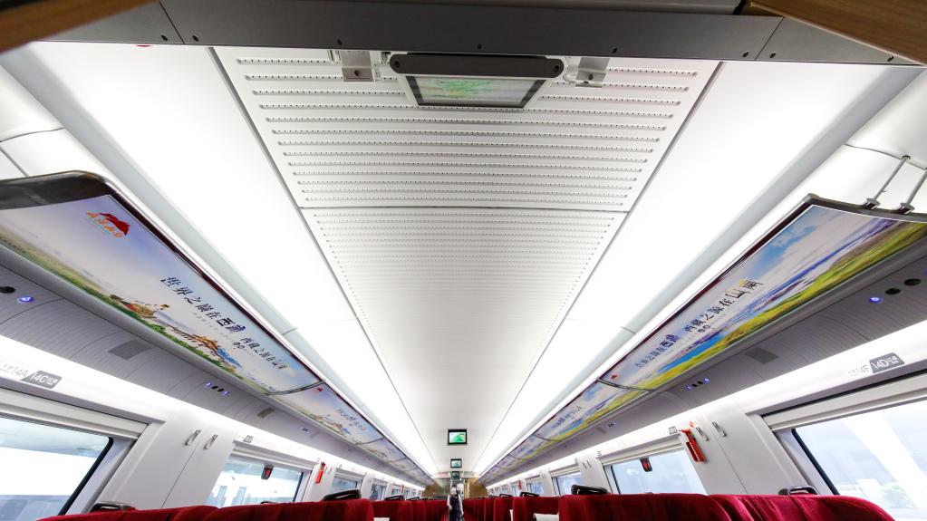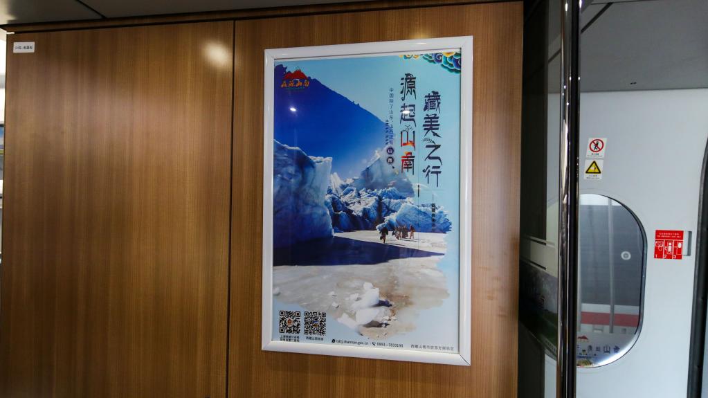 從站臺開始,醒目的車身外彩貼盡入乘客眼中,由此,山南文化旅游的元素就將伴隨乘客的整段旅程。全列車廂,雍布拉康、昌珠古寺、桑耶古鎮(zhèn)、羊卓雍措等旅游目的地與“藏美之行 源起山南”“世界之巔在西藏 西藏之源在山南”等旅游口號互相輝映,將山南歷史文化與盛景濃縮其中,呈現(xiàn)在旅客面前,讓大家近距離感受山南迷人的美景和悠遠的歷史。