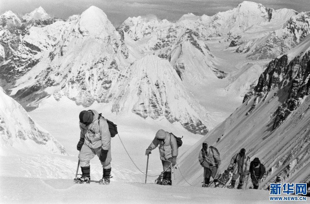照片拍攝于1960年5月,中國登山隊(duì)隊(duì)員在海拔7150米的冰雪坡上行進(jìn)。新華社發(fā)