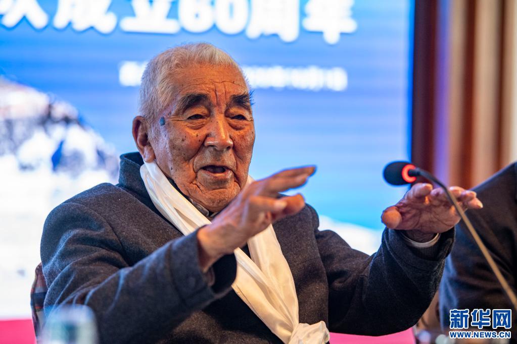 2020年10月1日,87歲高齡的老登山家貢布在慶祝中國西藏登山隊(duì)成立60周年活動上致辭。新華社記者孫非攝