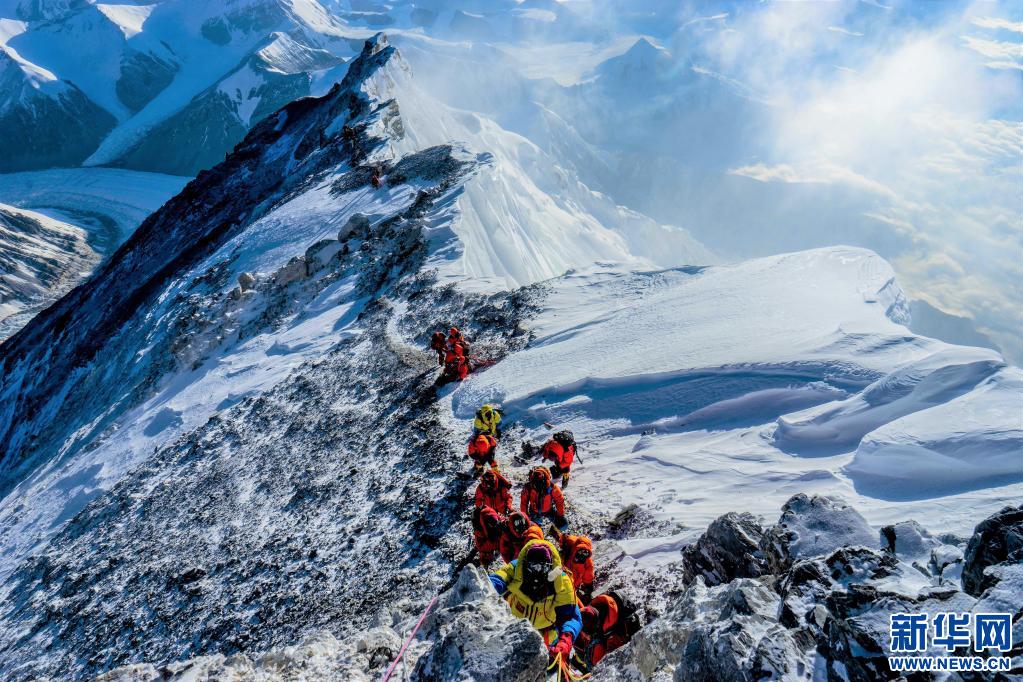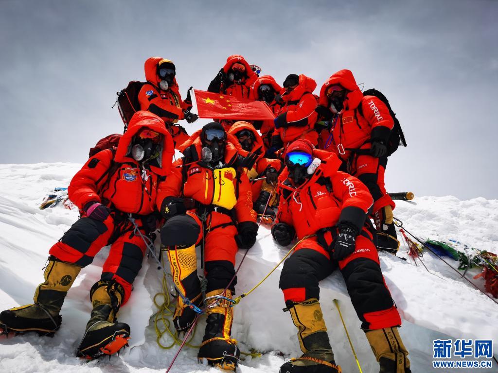 2020年5月27日,2020珠峰高程測量登山隊(duì)在峰頂合影留念。新華社特約記者扎西次仁攝