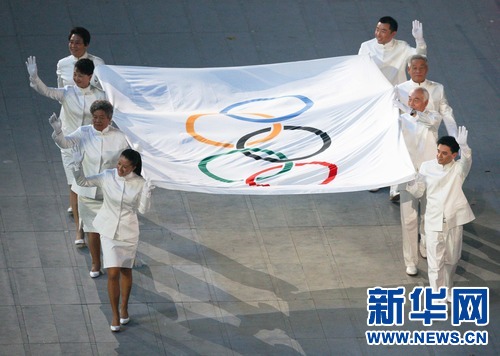 2008年8月8日,中國首位珠峰北坡登頂?shù)呐巧郊遗硕啵ㄗ筮厪那皵?shù)第二位)在北京奧運(yùn)會開幕式上,手執(zhí)奧林匹克會旗入場。新華社發(fā)