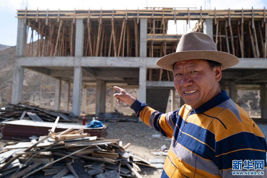 次仁格旦的父親在新蓋的旅館前監(jiān)工。新華社記者普布扎西攝