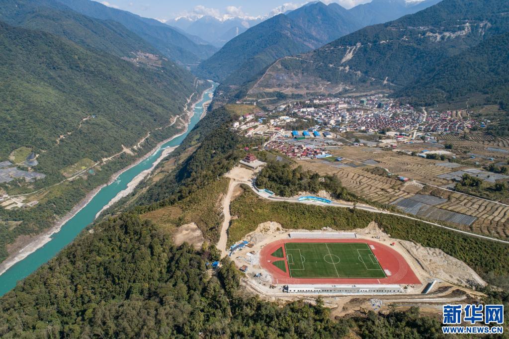 墨脫縣新建的11人制足球場位于雅魯藏布江邊(無人機(jī)照片)。新華社記者孫非攝