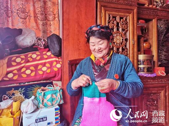 央金正在織毛衣,陽光灑在她的臉上。人民網 李海霞攝