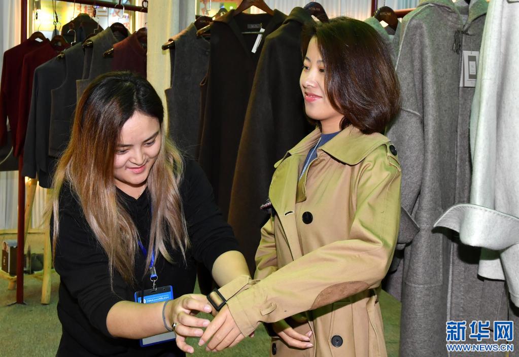 顧客在藏博會上試穿當?shù)禺a的服裝(2018年9月8日攝)。 新華社記者 覺果 攝