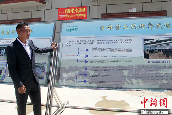 圖為6月2日,凈土牧場郭慶場負(fù)責(zé)人阿旺多布杰向記者介紹相關(guān)情況。中新社記者 陳小愿 攝