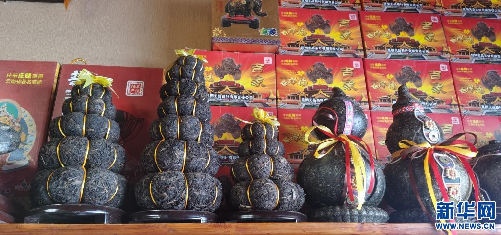 在位于西藏拉薩的一家茶葉公司的門店內(nèi)擺放著造型獨(dú)特的茶葉制品(4月23日攝)。新華社記者 張京品 攝