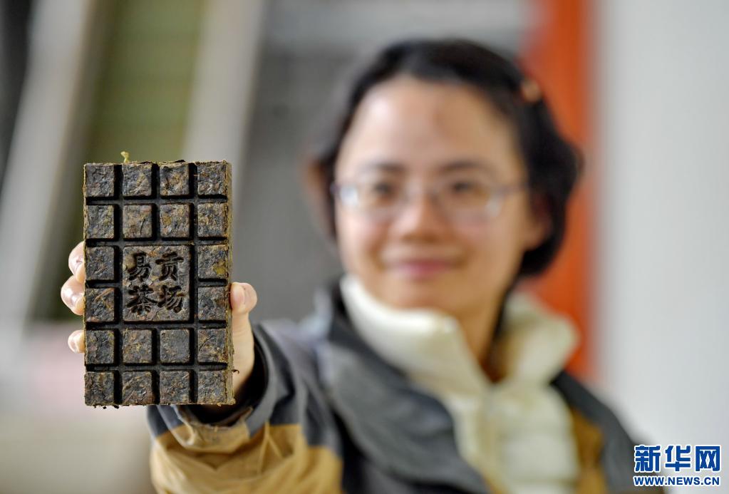 西藏易貢茶場(chǎng)的一名工作人員展示生產(chǎn)的特色茶磚(5月22日攝)。新華社記者 張汝鋒 攝