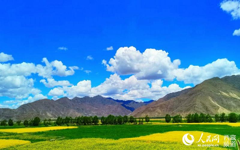 近3萬畝小油菜花在藍(lán)天白云下綻放。格桑倫珠攝