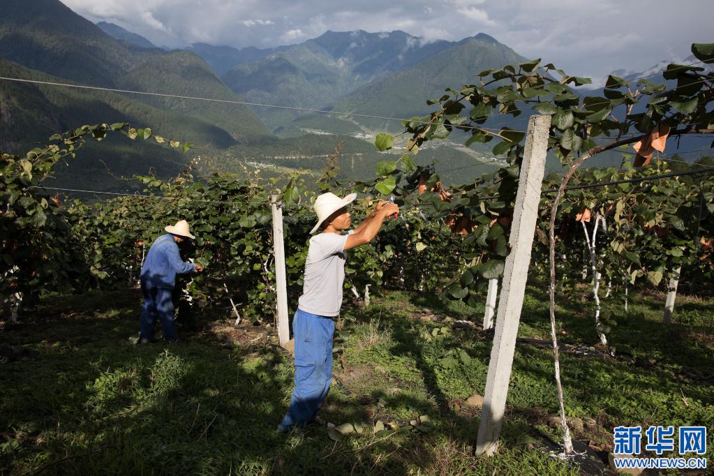 在西藏自治區(qū)林芝市察隅縣下察隅鎮(zhèn)京都村,獼猴桃園工作人員在修剪獼猴桃枝葉(7月22日攝)。京都村通過(guò)“公司+農(nóng)戶”模式引進(jìn)了獼猴桃種植,幫助村民增收。新華社記者 金立旺 攝