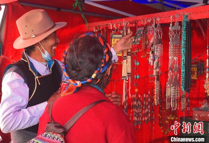 圖為一對藏族夫婦在打隆物交會(huì)上選購飾品。冉文娟 攝