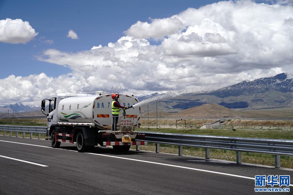 工人正在京藏高速那曲至羊八井段為路邊綠化植被灑水(2021年6月28日攝)。 新華社記者劉洪明 攝