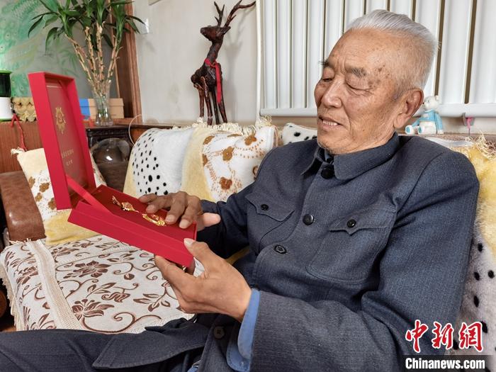 資料圖為7月27日,西藏運(yùn)輸總隊(duì)成立后第一批進(jìn)藏的駝工李興仁向記者展示自己獲得的“光榮在黨50年紀(jì)念章”。 中新社記者 祁增蓓 攝